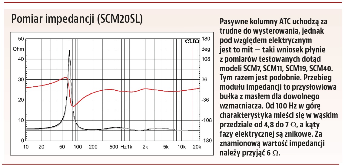 - Impedance measurement (SCM20SL) Passive ATC loudspeakers are considered difficult to drive, but electrically this is a myth... The impedance module curve is a proverbial piece of cake for any amplifier. From 100 Hz upwards, the frequency response falls within a narrow range of 4.8 to 7 Ω, and the electrical phase angles are negligible. The nominal impedance value should be assumed to be 6 Ω.